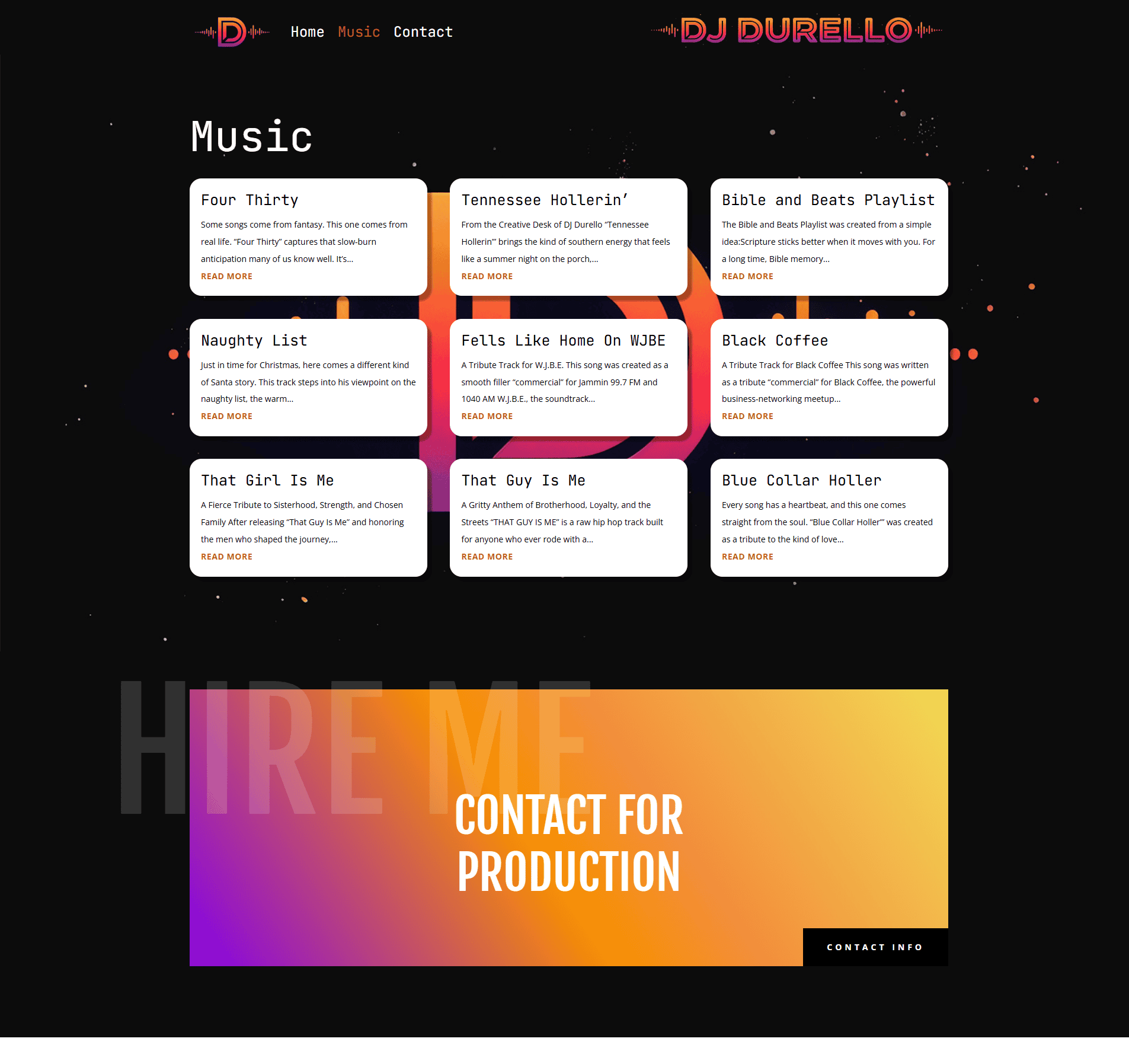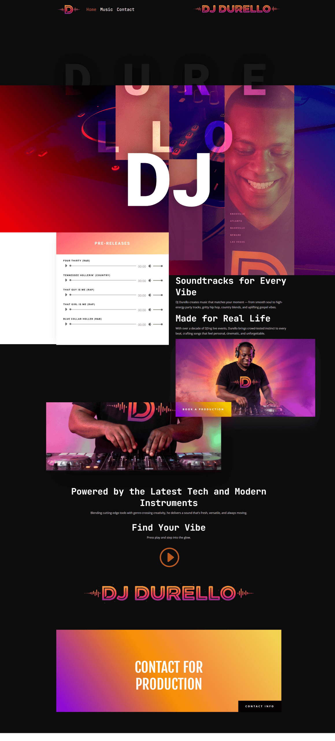 Eternal Marketing Group partnered with DJ Durello to develop a full-stack creative and distribution ecosystem, guiding the project from concept to global release. Our work included brand identity development, logo design, custom website build, original audio production, and album cover graphic design, all supported through our in-house Eternal Marketing Record Label for streamlined release management. The singles Tennessee Hollerin’ and Four Thirty were produced and distributed for worldwide reach and can now be heard on Spotify, Apple Music, Deezer, Pandora, Amazon Music, and more than 30 additional platforms globally. The result is a cohesive artist brand with professional-grade assets, scalable distribution, and a clear creative identity built for long-term growth across music, media, and live experiences.
